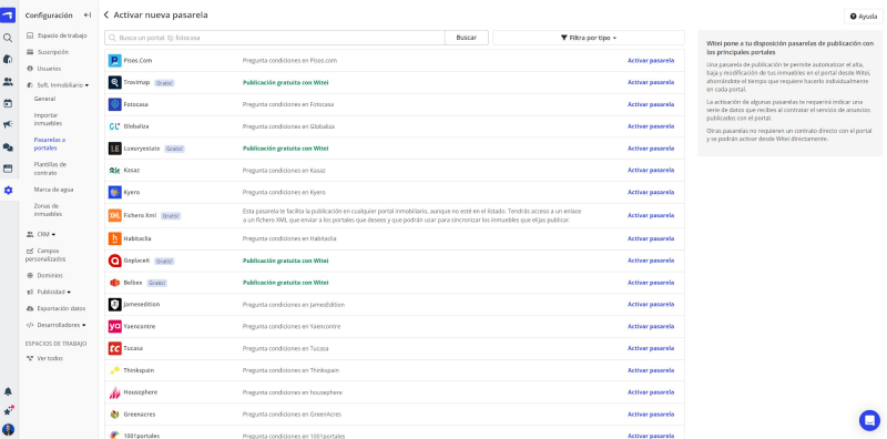 - Integración directa con portales inmobiliarios externos (Pasarelas) : al tener esta posibilidad, el software inmobiliario agiliza mucho el proceso de publicación directa en estos portales externos a la herramienta, con un simple clic aparecerá el inmueble en los portales inmobiliarios activados desde dentro del software.