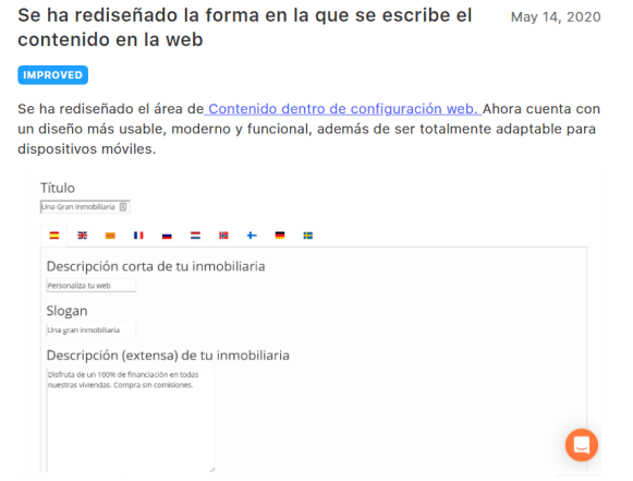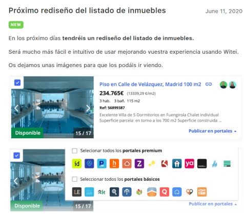 Por ejemplo: Recientemente avisamos de que se iba a hacer un rediseño de todo el listado de inmuebles. Te avisamos con antelación para que no te pille tanto de sorpresa.
