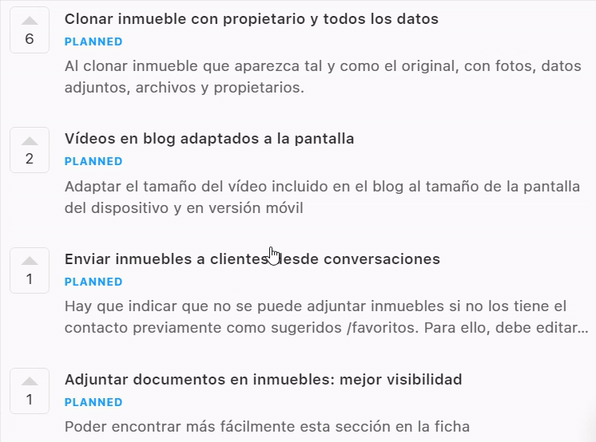 Por ejemplo, la primera sugerencia que ves: «Clonar inmueble con propietario y todos los datos» es muy interesante porque actualmente esto no ocurre cuando clonas un inmueble. Se podría ahorrar mucho tiempo si se clona exactamente igual al original . Cómo ves, tienes un «planned» debajo.